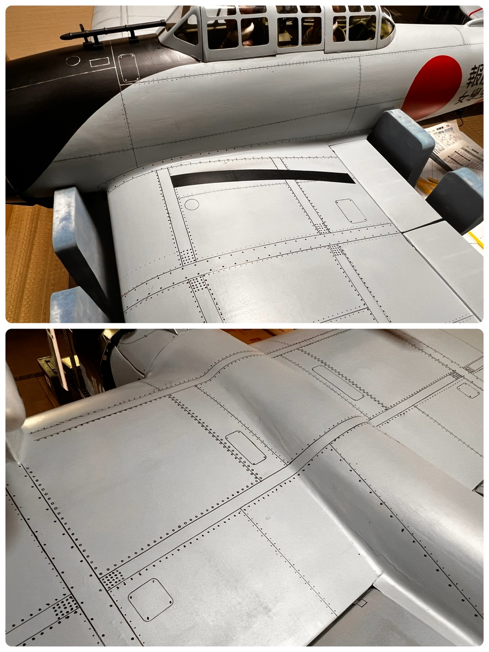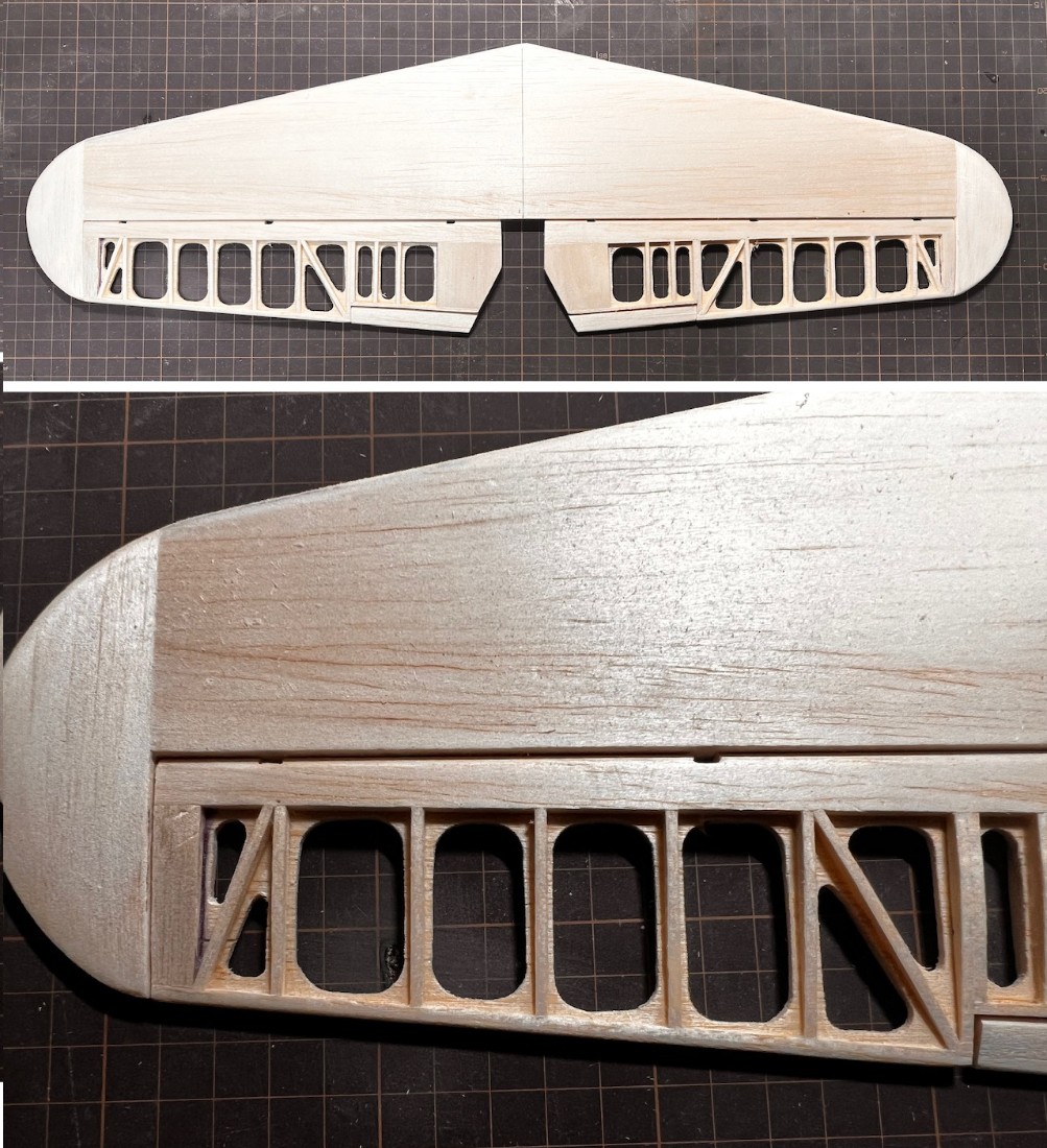 この後、安定板はマイクログラスを貼り、昇降舵の羽布張り部分は絹張りします。