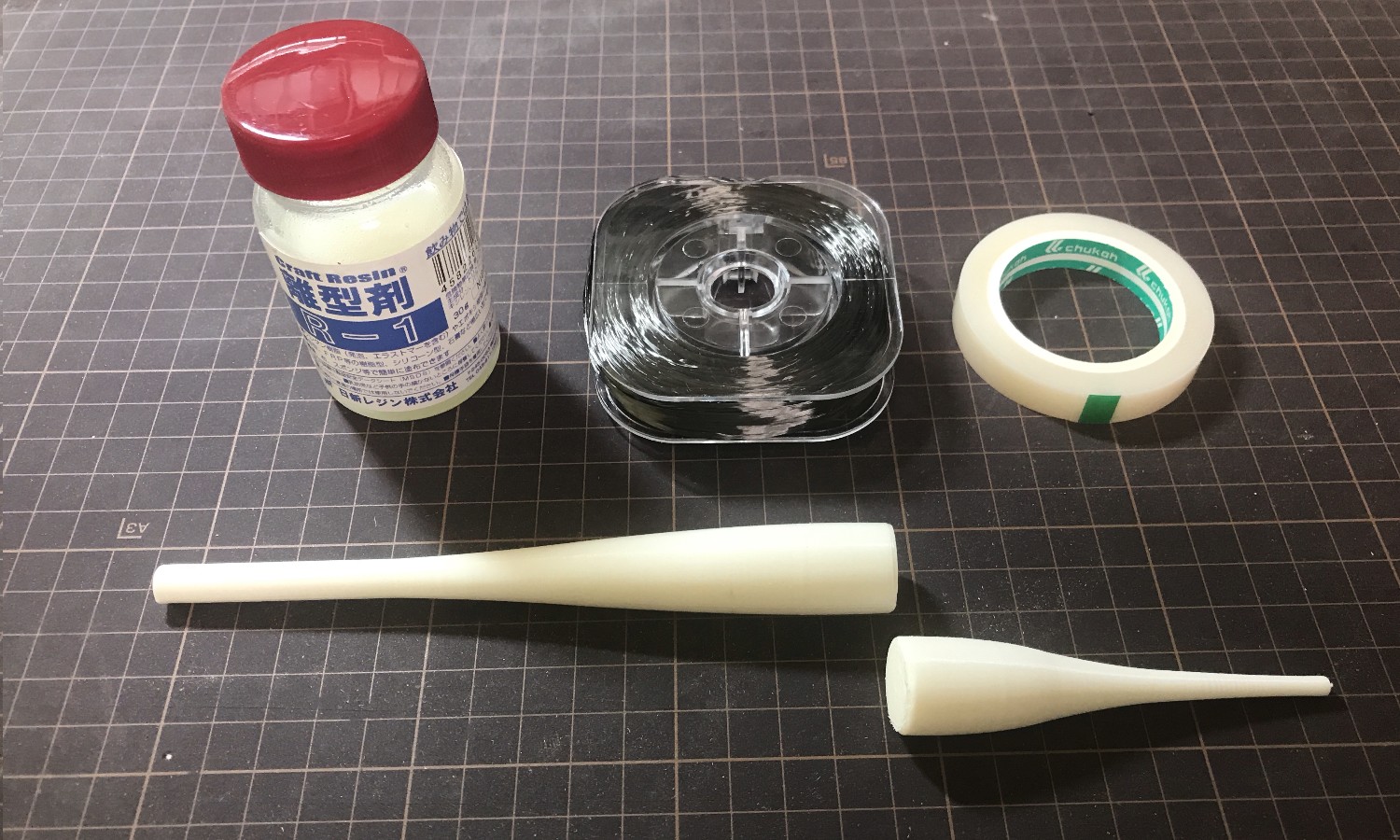 まずは3Dプリンタで雄型を作ったので、離型剤を塗ってから、カーボンロービング(16K)を巻き付けてエポキシレジンで固める。次に前後2パーツを接着したらカーボンクロスを貼って、レジン塗り後、フッ樹脂のテープで強く巻き付ける・・・で、できる・・・はず。