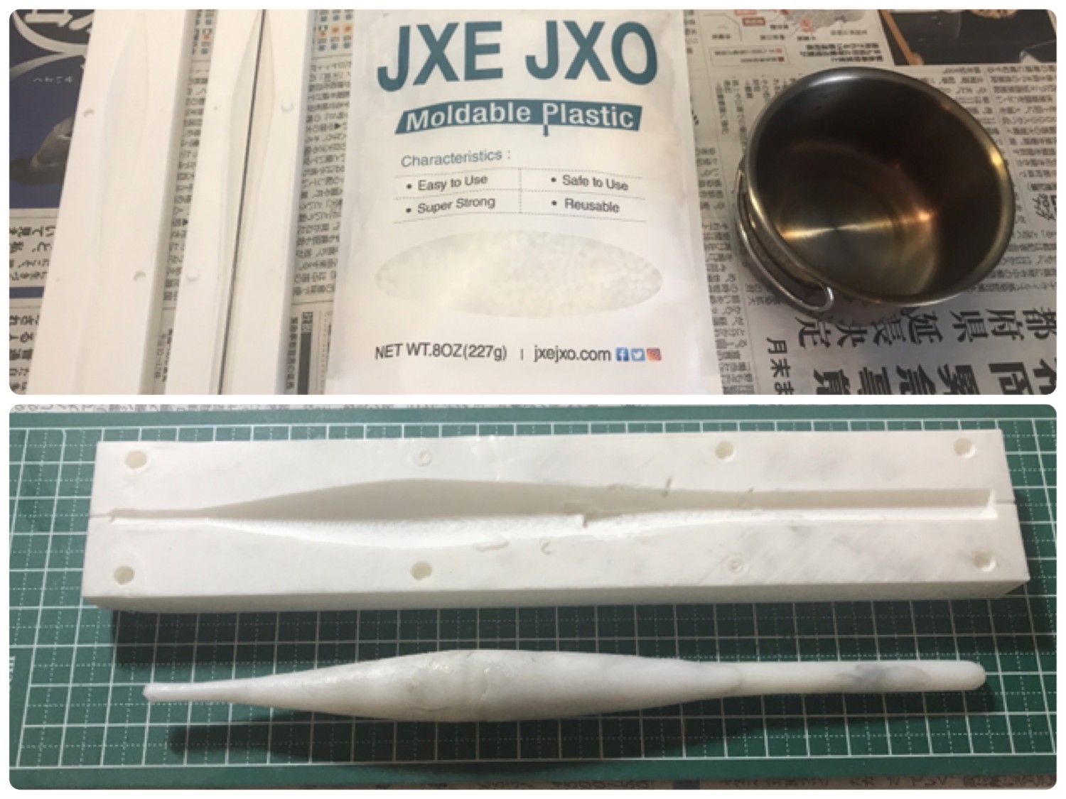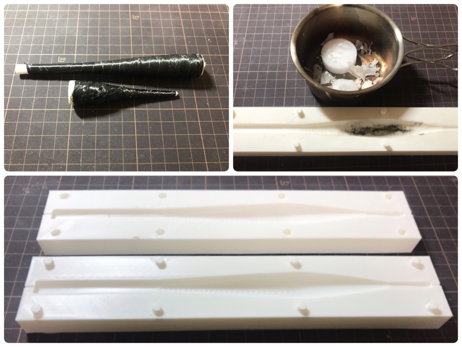 「作戦変更」3Dプリンタで雌型を作り、ロウを流し込んで雄型を作る。その雄型にカーボン処理をした後、温めれば型が抜けるという方法に変更。某塚本家での作戦会議ではロウのほかに石鹸、飴、チョコレート、カレーなど固形だが熱で溶ける材料を議論。