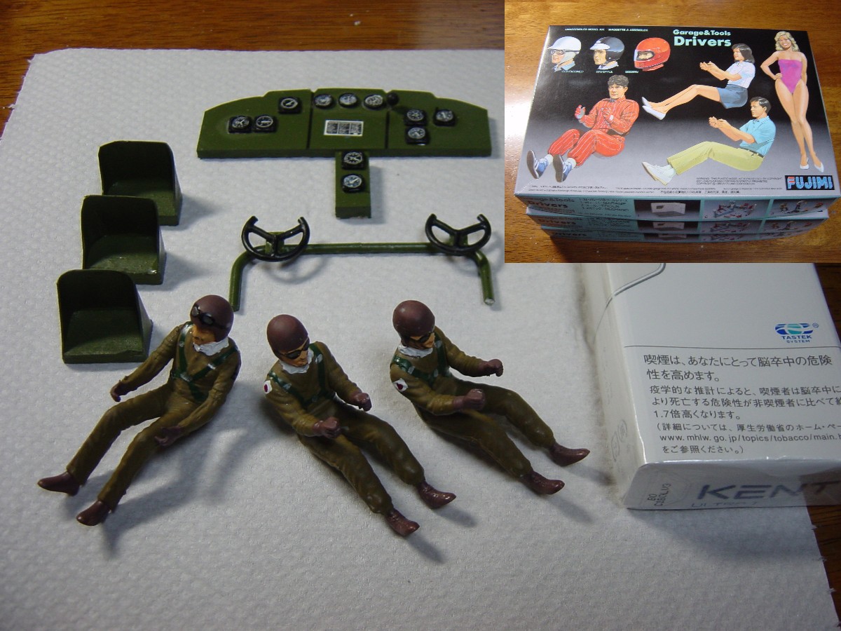 写真にあるフジミのプラモデルは、3体(レーシングスーツ、男性ドライバー、女性ドライバー)+ハイレグのおねえちゃん。女性ドライバーの胸を削り、肉を盛って・・・でも到底、飛行兵にはなり得なかったので、レーシングスーツと男性ドライバーから、操縦士、副操縦士、指揮官の3人を作成した。それにしてもプラモデルを3セット購入したものの、金髪・ハイレグのおねえちゃんだけが使えなく残ってしまっている。綺麗に仕上げて誰かにプレゼントしようか?