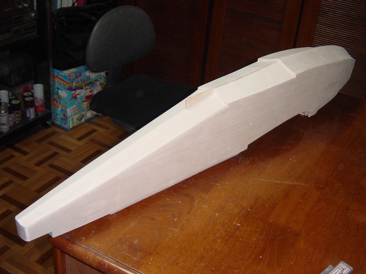 ・・・能書きはこれくらいにして、やっぱり「かつおぶし」を付けなきゃ二式大艇じゃないので、ベニアを艇底に現物合わせで付けてみた。考えてみれば離陸(地面を滑らす)にはまったく関係ないし、飛んでからも有害抵抗以外なにものでもない。でも、こういう所にこだわるほど、飛行機作りは一層楽しくなる。私の考え方が普通じゃないのかしらん?