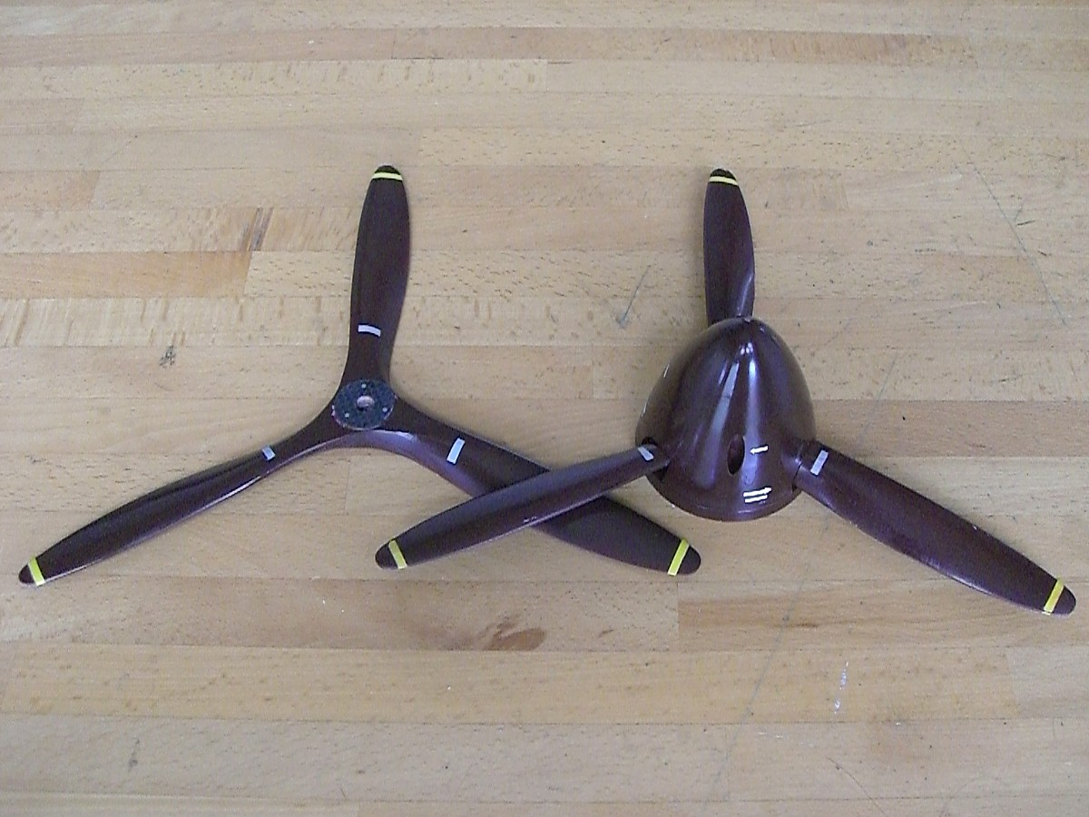 まずはプロペラを作りました。え?って感じですが、3枚ペラで住友ハミルトン製のイメージに近いものがなく、なければ作るのが信条。APの12×5をベースに3ブレードを冶具で張り合わせ、中央に1mmアルミ板、上下は0.8mmのカーボンを貼り、1.8mmピアノ線をノックピンとして差込みました。ペラの先端のカーブも住友ハミルトン型に少し削り、バランスを取ってから塗装。