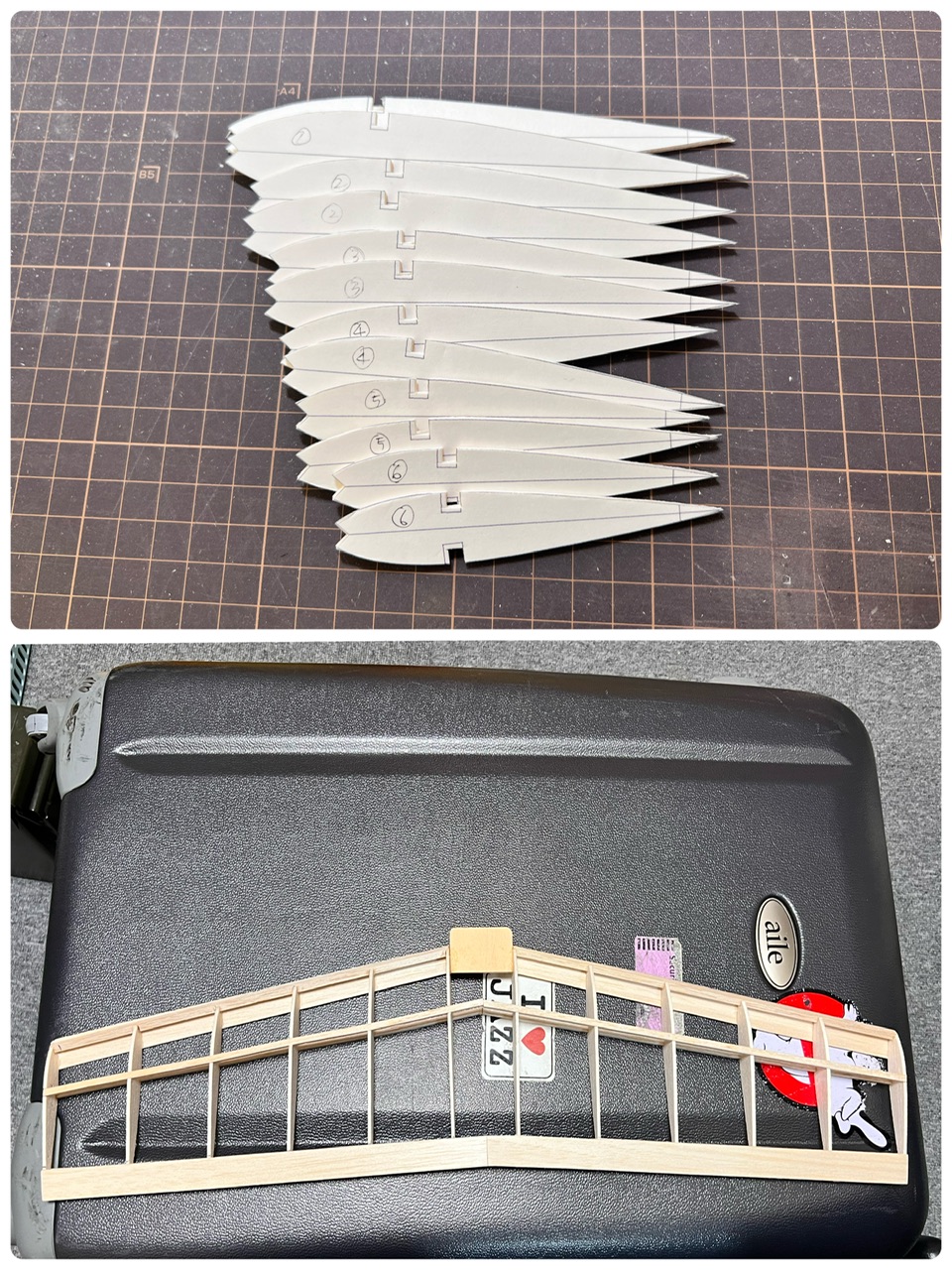 まずはWingProで主翼リブ形状をプリントアウトし、バルサに貼って切り出し。どうせ作るならと実機同様の後退翼+上反角を付けました。 今日一日で主翼は組み立てまで完了。