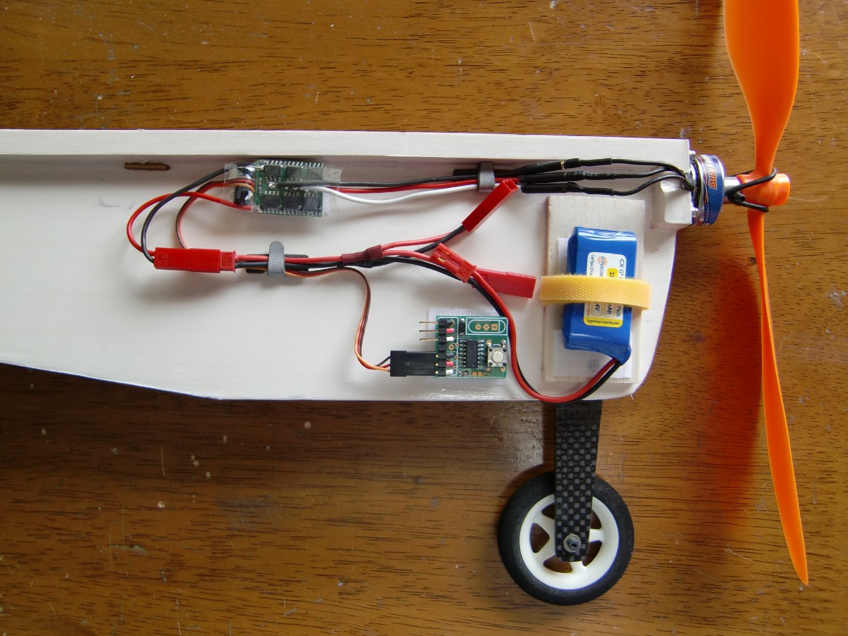 モーターはHK2314-2000KV、アンプはフェニックス10A、ESCはホームズさん特注のソーラープレーン専用のものです。1号機では空気抵抗を考慮してスチレンペーパーで胴体を作りましたが、今回は「みてくれ」ではなくメンテナンス性を考え、むきだしのプロフィール形式です。
