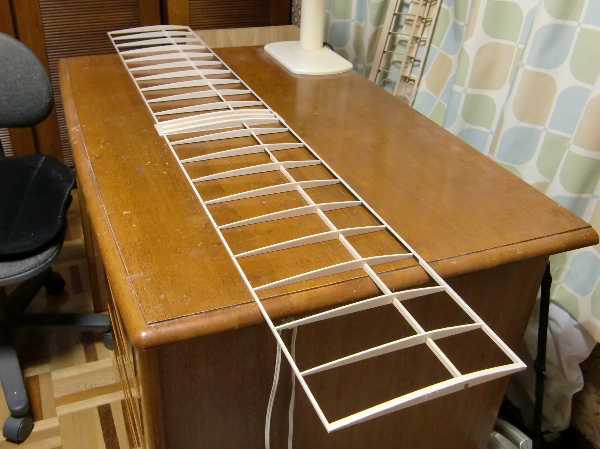 ワイヤーは空気抵抗も考慮し単線を使い、まずは12mくらいでスタートするつもりですが、果たして飛ぶのやら・・・試験飛行は次の天気の良い舞木グラウンドでの飛行会の日。