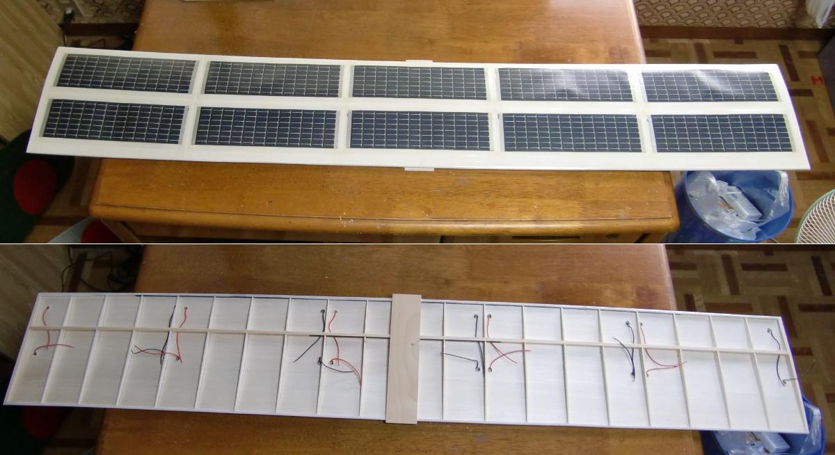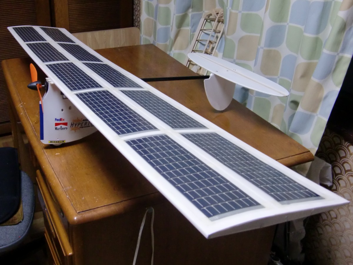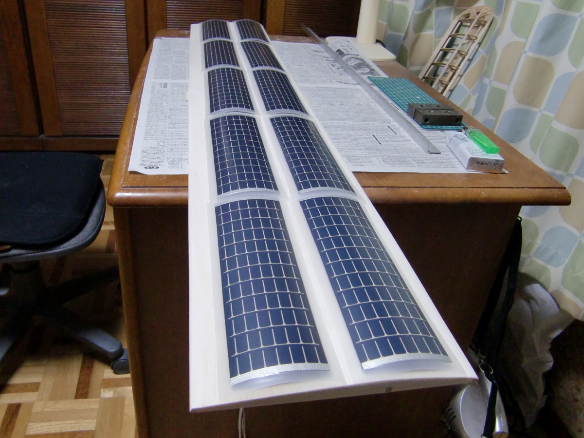 ちなみに主翼を完成させた時点で、太陽電池のみでモーターを回してみたところ、部屋の中での太陽光でもかろうじて回りました。スタート時など電流がたくさん必要なときはバッファ用のニッカド電池からも供給されるので、ほぼ計算どおりの出力は出そうです。