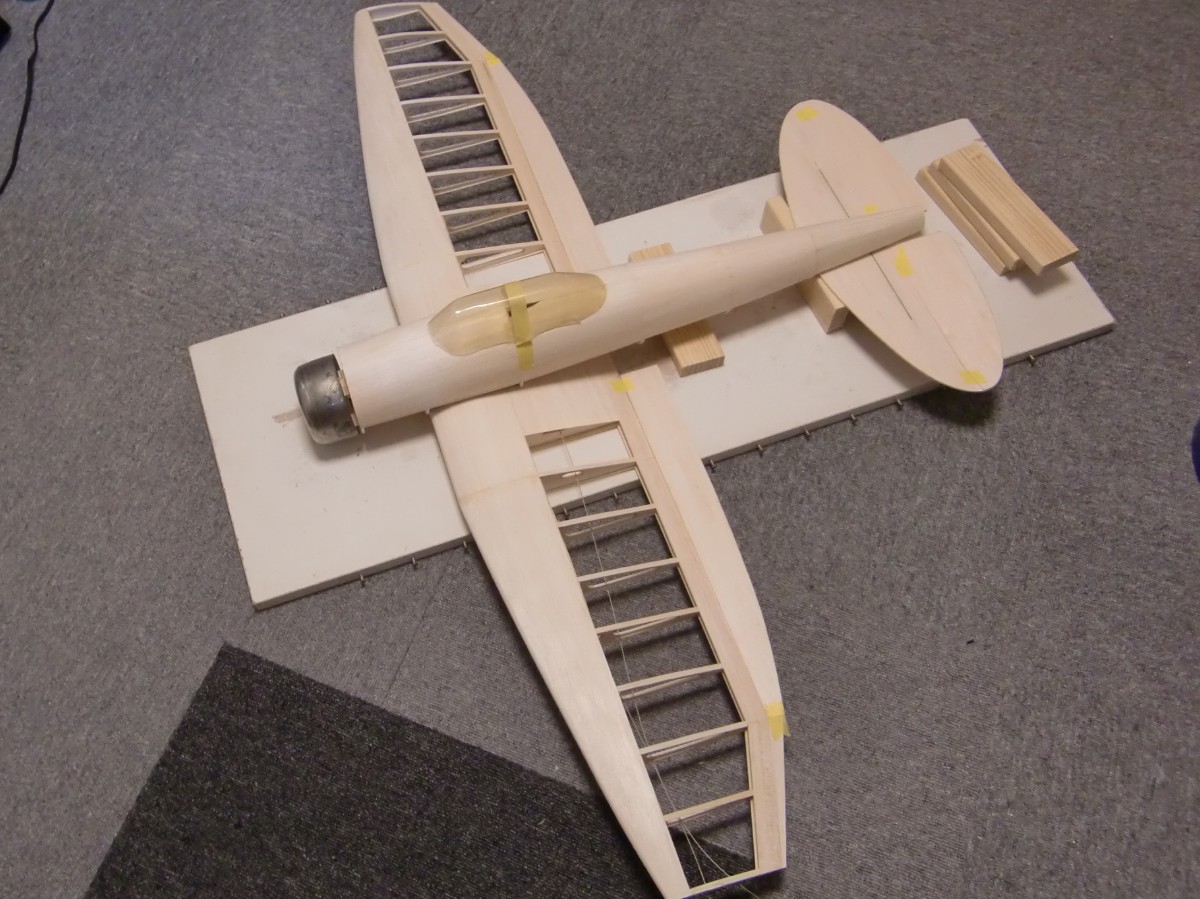 各パーツごとに作ってはいるものの、ここまでできると、つい全体イメージを早く見てみたくなり、主翼・尾翼を置いてみました。
