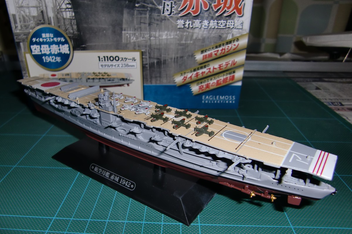 恐らく、そのうちに、甲板の日の丸を消して、明灰白色の零戦とまだら緑の九七艦攻と明灰白色の九九艦爆に修正して1941バージョンの赤城にしてしまうと思います。その前に飾るためのケースを買わないと。