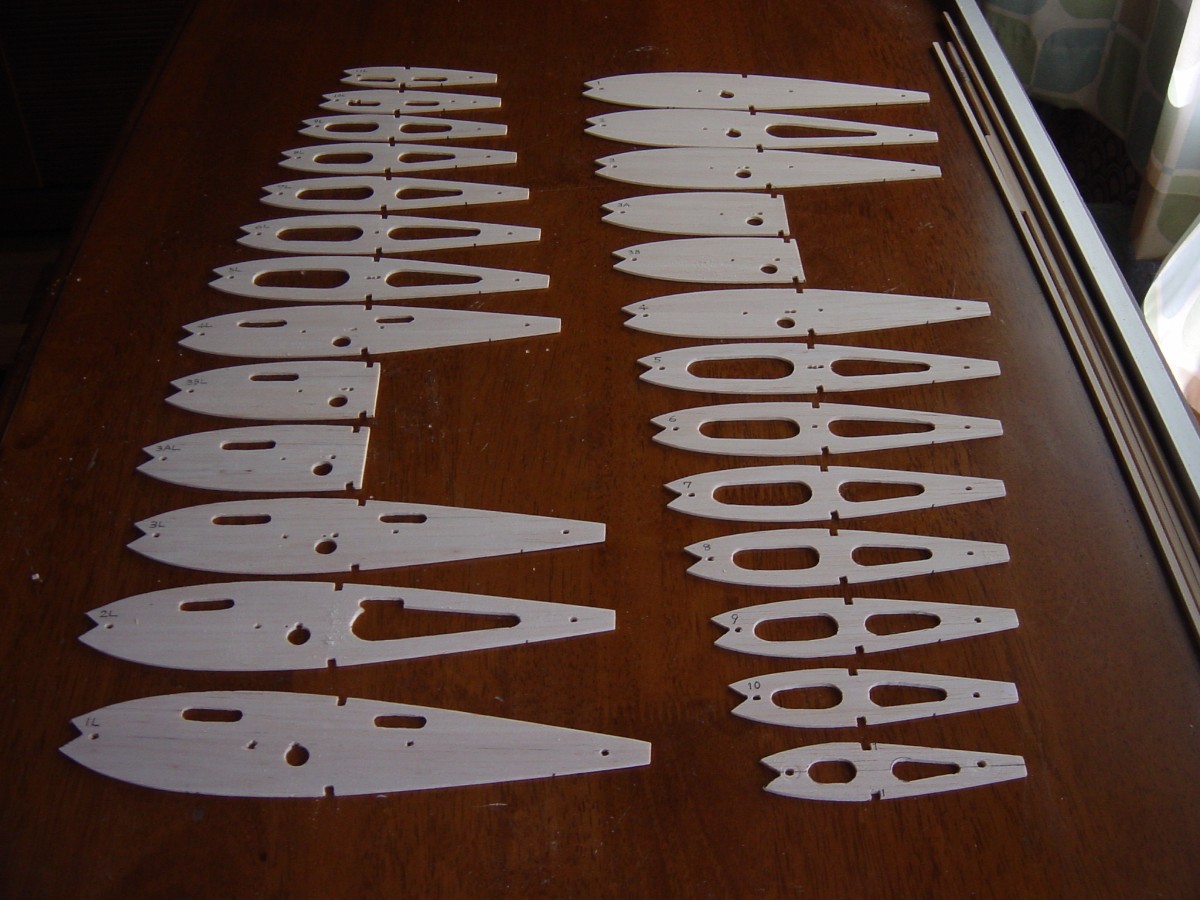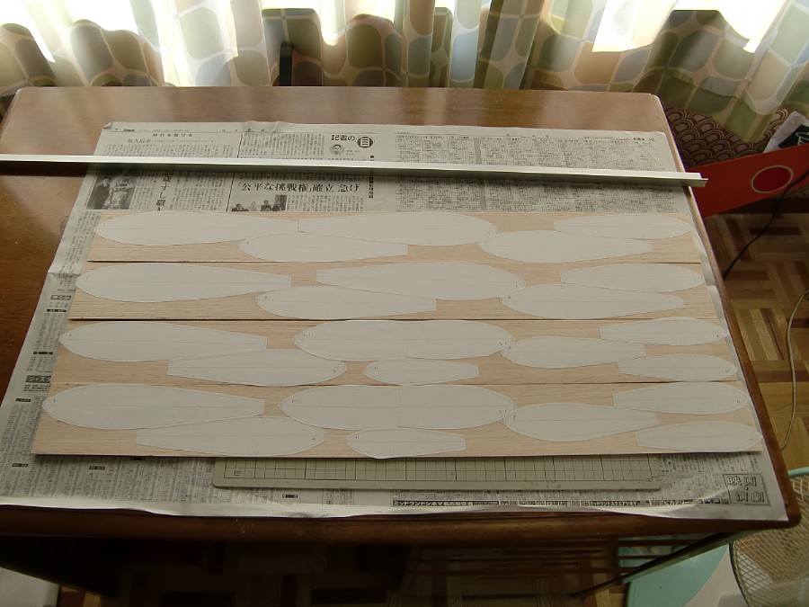 リブはいつもどおりWingProというPCのソフトですべてのリブ型をプリントアウトし、2mmバルサに貼り付けカットしていきます。エンジンナセルとの接合部分やモーターへの電力ケーブルなど、普通のUコン機にはない部分にも気を使いながらの肉抜きも必要です。