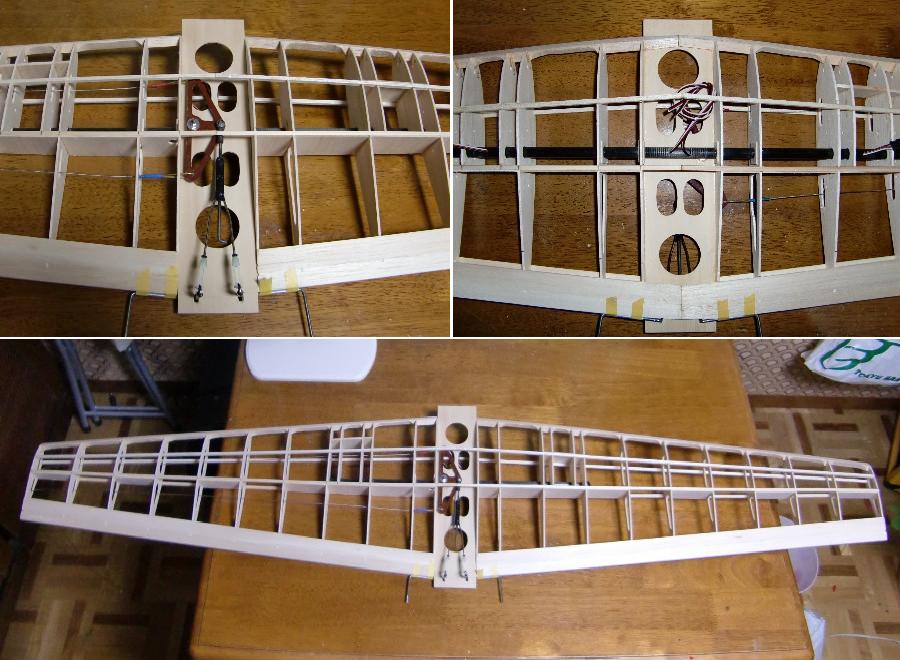 いつもながら、組立ながら考え、考えながら組み立てる。図面はすべて頭の中。上半角とリンケージ、ナセルの取り付け方法と主翼自体の強度、胴体との合体方法など、普通のUコン機にはない部分が多く、なかなか先に進まない。