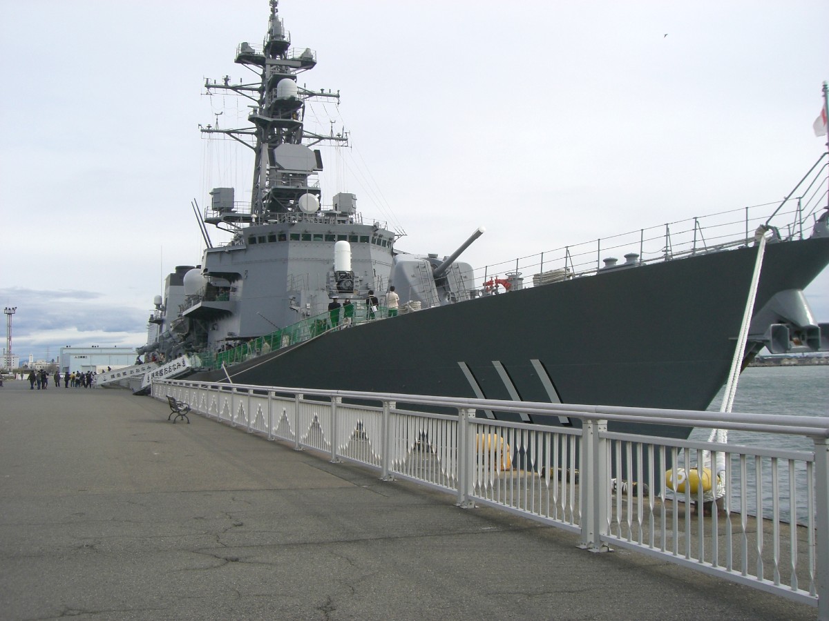 地下鉄「名古屋港」駅を降り、久々のワクワク感で、埠頭に歩いていくと、まず出迎えてくれるのは、「南極観測船 ふじ」。常時繋留というか、埠頭に固定されていますが、老朽化のため、化粧直し中でした。その奥に見えるマスト・・・でけぇ!乗船したいというはやる気持ちを抑え、まずは全体がカメラで写せるよう艦首へ向かいました。