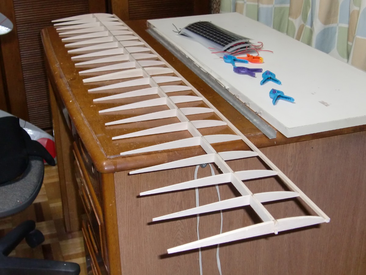 1号機は全備重量452gと軽く仕上げたつもりですが、まったくのパワー不足。今回は構造も新たにさらなる軽量化をしてみることにしました。1号機はソーラーモジュール10枚を含めて主翼が236g、今回は主翼だけで200g以内に収めたいところ。翼長1300mmの飛行機を300g台で作るためには、強度と重量の限界を見極めないと難しそうです。