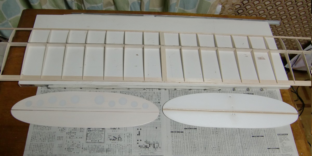 この状態で285g。あとはバッファ用バッテリーとアンプ、ESCなどメカ関係と翼端オモリ、リンケージなどだけなので、重量は想定内に収まりそうです。強度的に不安な部分もありますが、簡単に飛んでしまうと「ゲテモノ大会」でギャラリーも興ざめするだろうし、微妙なところ。何せ、主翼スパン1300mmの主翼が174gですから!Uコンなら35クラス?とても信じられない軽さです。