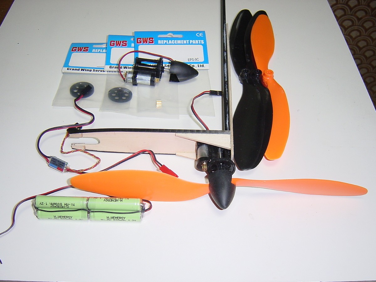 今日は予備バッテリー(陽がかげれば当然パワーなくなりますから、余ったパワーは常に充電する予定)を準備。ニッケル水素の単4型を6本購入し、見よう見まねで6セルのパックを作りました。これでさえ初めての試み。まずはこの電池を動力に4種類のギアダウンユニットと4種類のペラで最も効率の良い、ソーラーパワーだけで回る組合せをチョイスすることにしました。